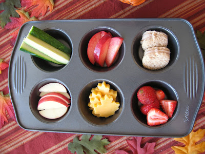 Rounding off this Muffin Tin Meal is are some whole wheat mini turkey apple-shaped sandwiches and leaf shaped cheddar cheese.